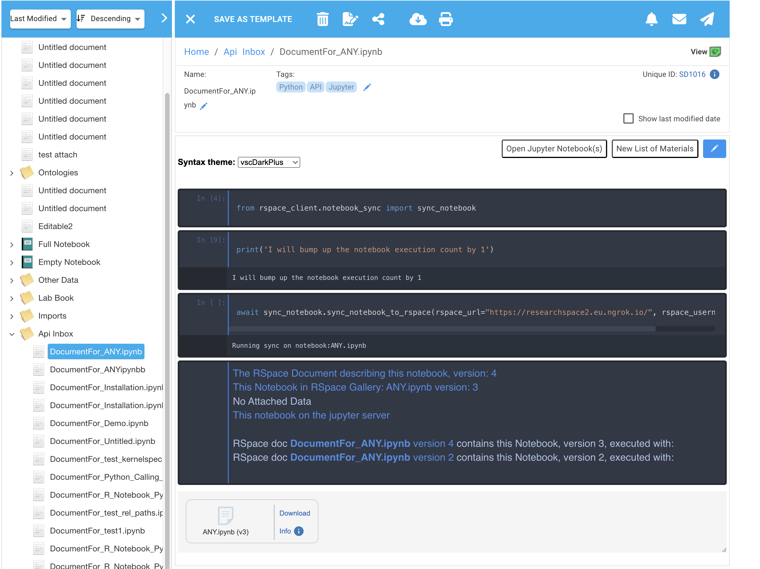 The following shows the default result in RSpace of running sync_notebook in a cell of the Jupyter Notebook called 'ANY.ipynb'