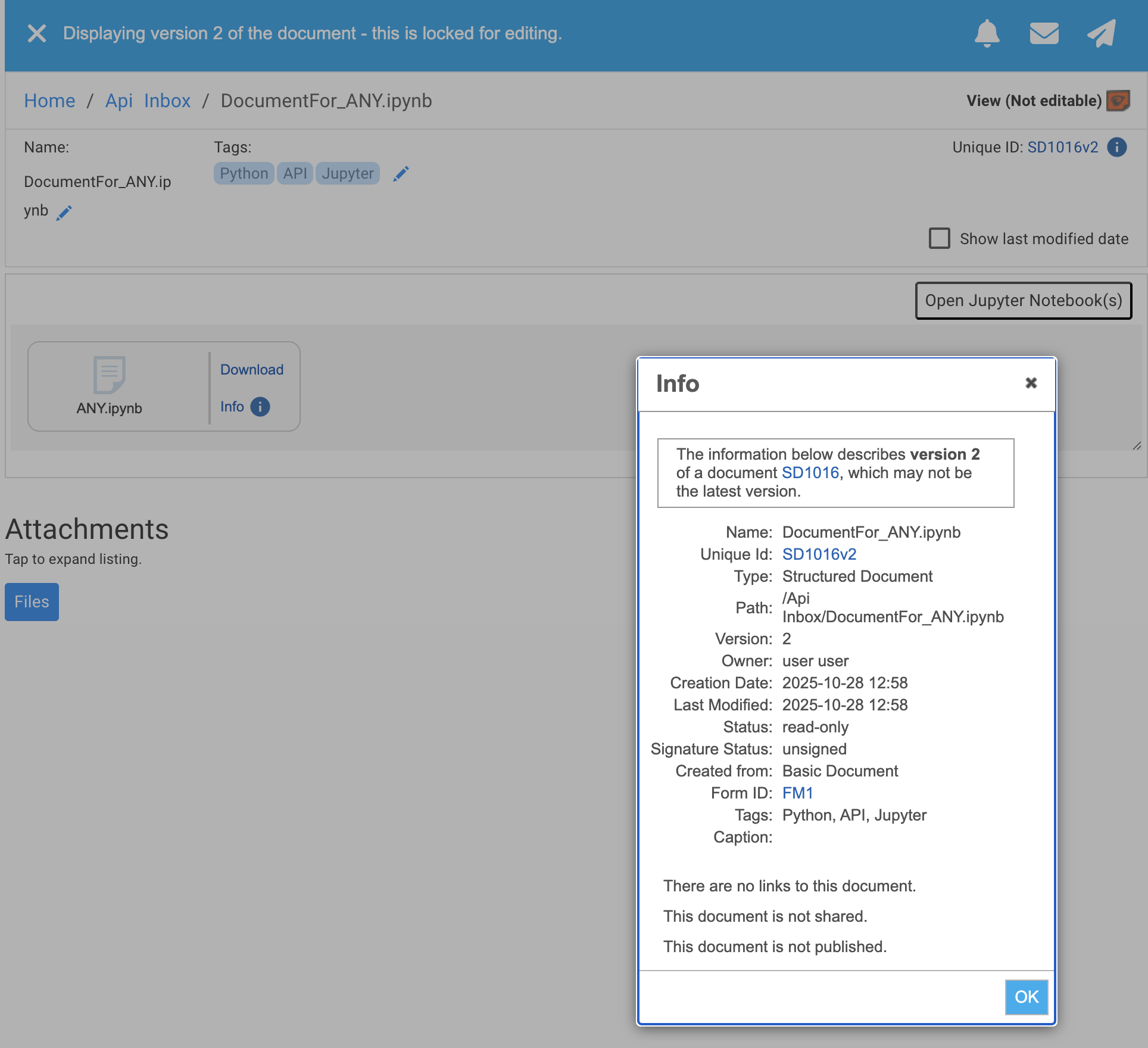 By default a new RSpace document is created to contain the Jupyter Notebook as an attachment. The RSpace document will be named 'DocumentFor_<jupyter_notebook_name>' and will be located in the Api Inbox folder.