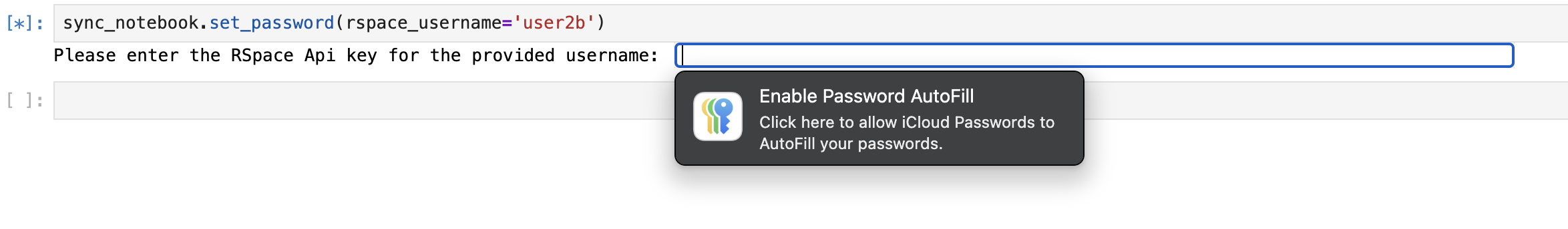 - When you first use sync_notebook you are prompted to enter an Api Token for the rspace_user. That token is saved and available in all notebooks; you will not be reprompted. However you will need to set an Api Token if you switch to syncing notebooks to a different RSpace user or if the original RSpace user regenerates their Api Token.