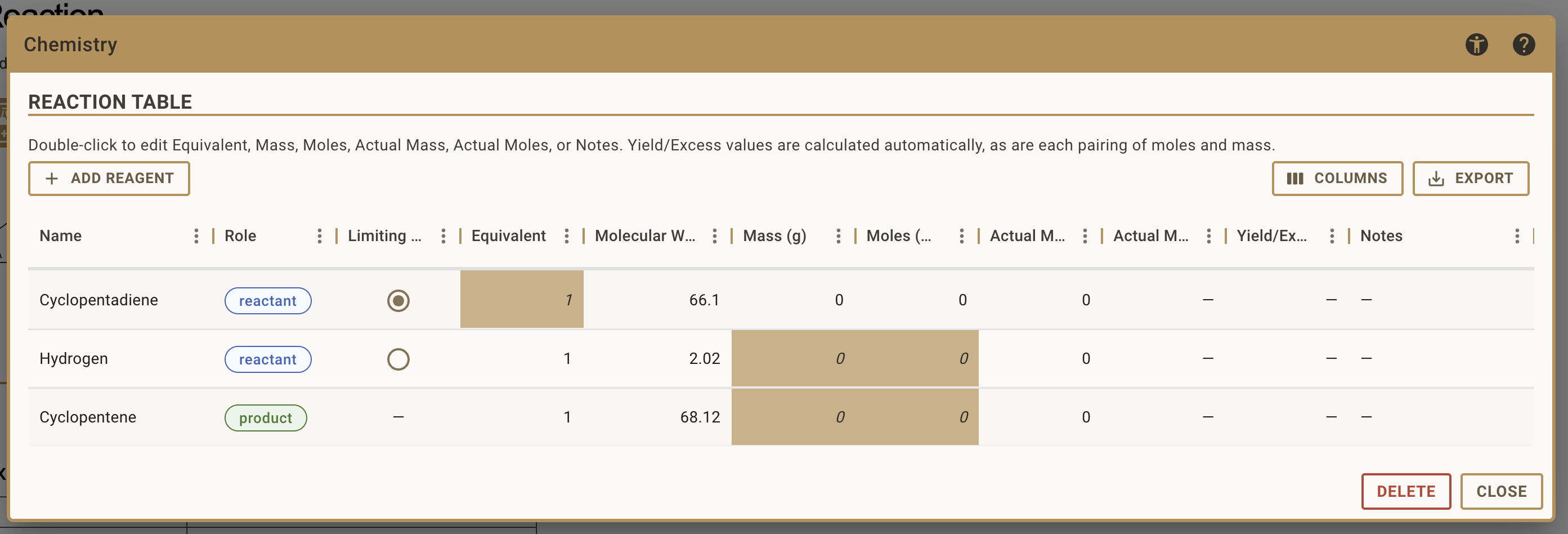 - Click "Add Reagent" on the top left of the stoichiometry table