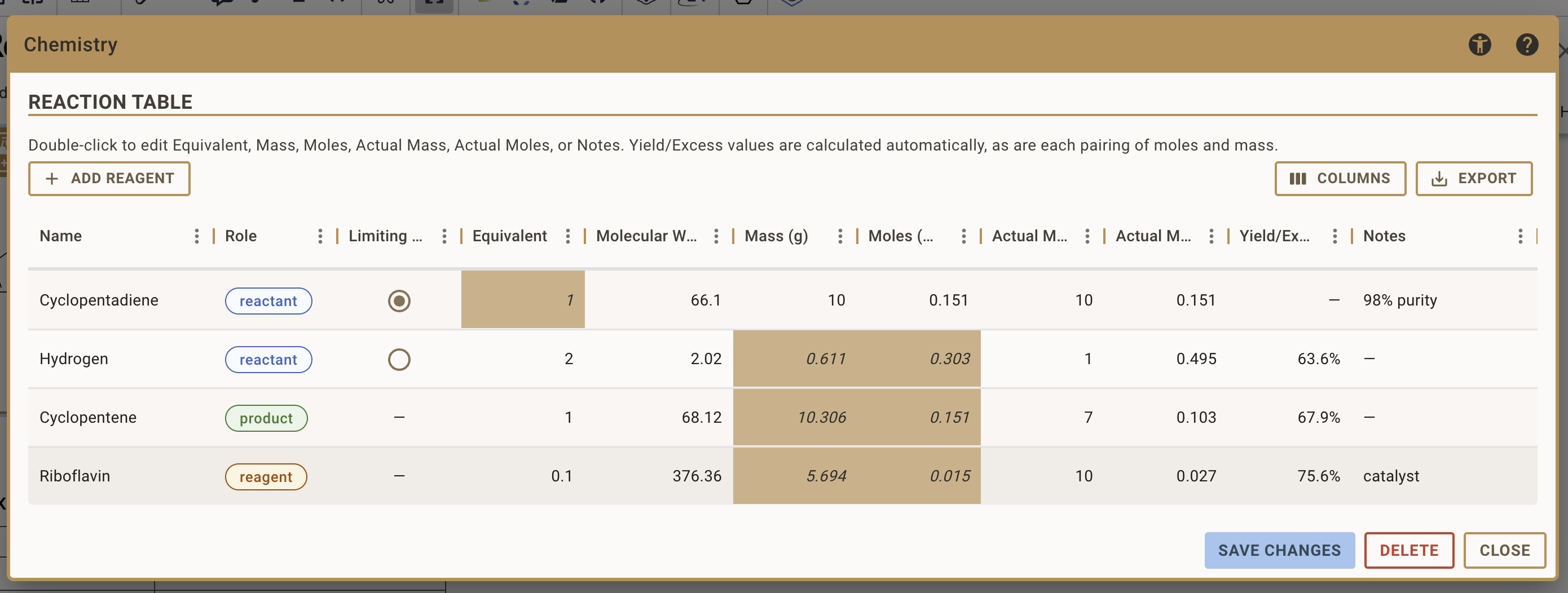 RSpace will automatically create a table with all reactants and products extracted from your reaction drawing.