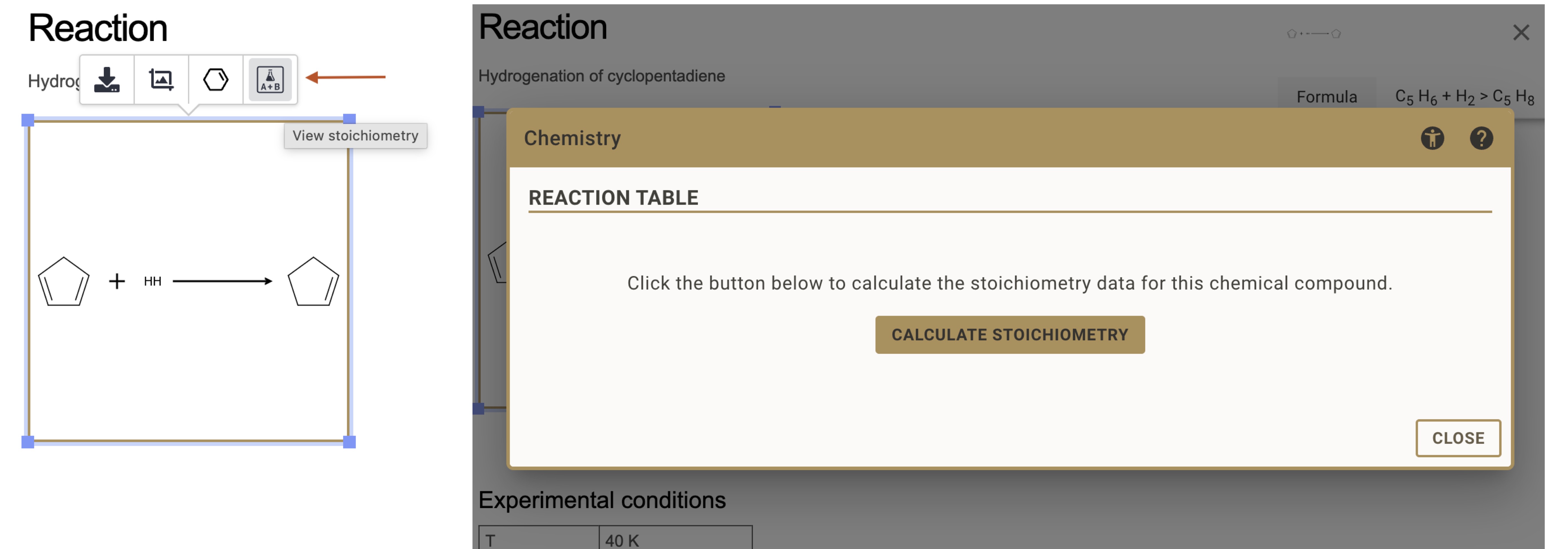 - Open the stoichiometry table via the stoichiometry button on the given reaction