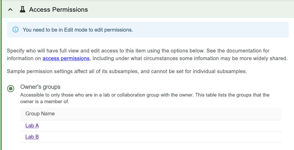 In the above screenshot, Lab A has been granted access to this sample and Lab B, despite having the owner as a member, is not granted access.