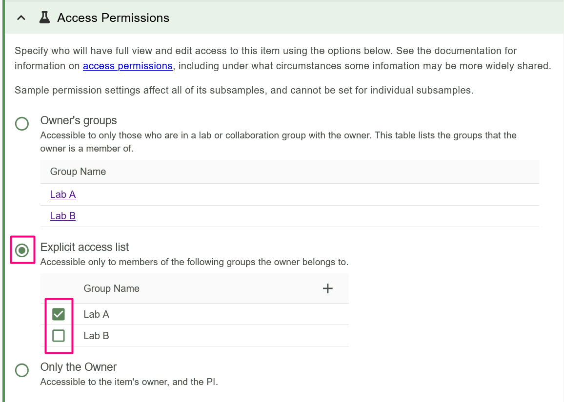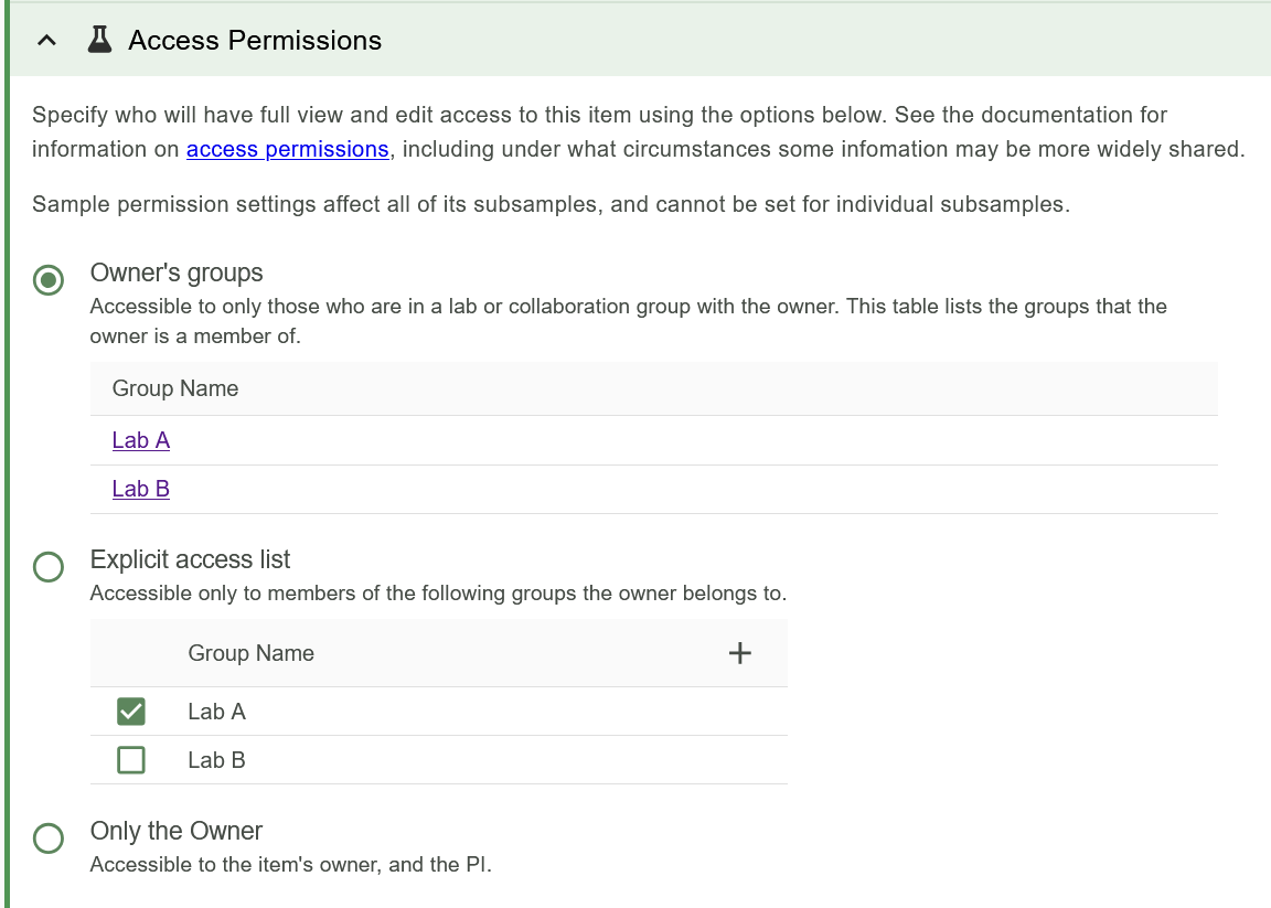 If no groups are selected in the access list, or Only the Owner mode is selected, then only the owner and their PI will have access.