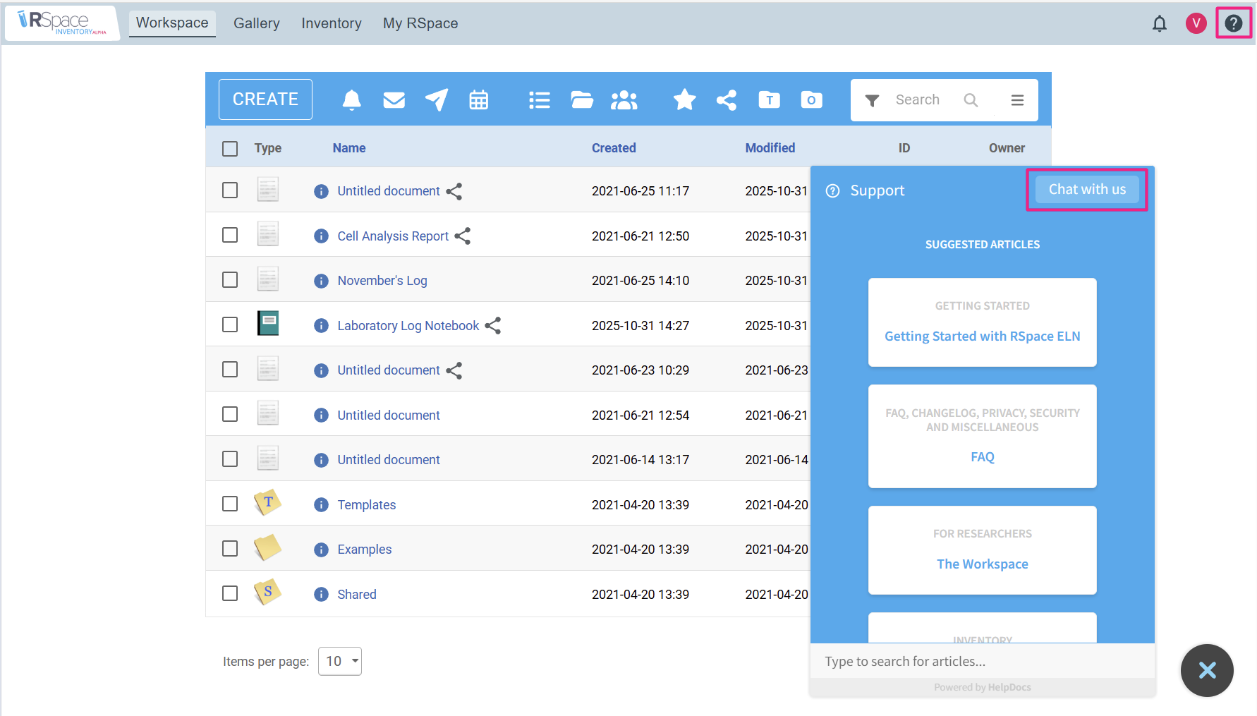 Some customers have access to our support through chat directly inside RSpace. When you're logged into RSpace, click on the ? icon on the right-side of the navigation bar.