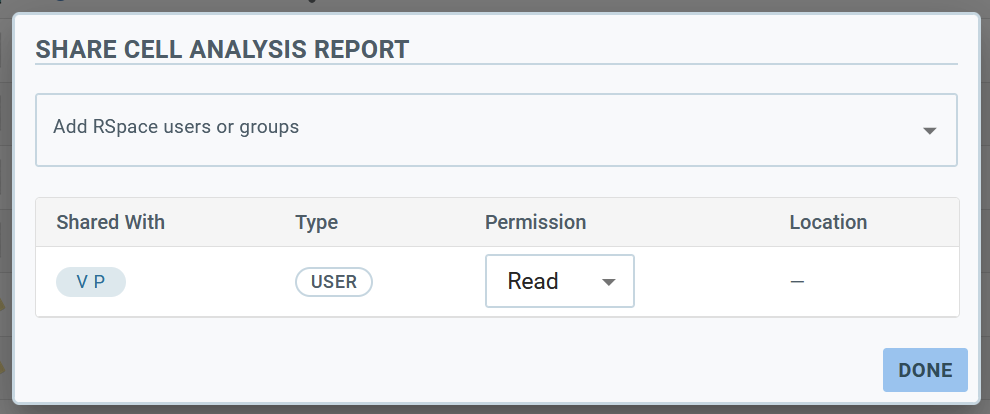 - The share dialog will display an autocomplete field for adding new shares, and if you've only selected one document or notebook, also its full share status. To view and edit the share status of multiple documents at the same time, you can use the My RSpace > Shared Documents page.