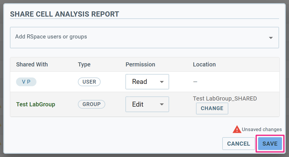 - Click Save to save changes and trigger any new shares, changes in permissions, or unshares.