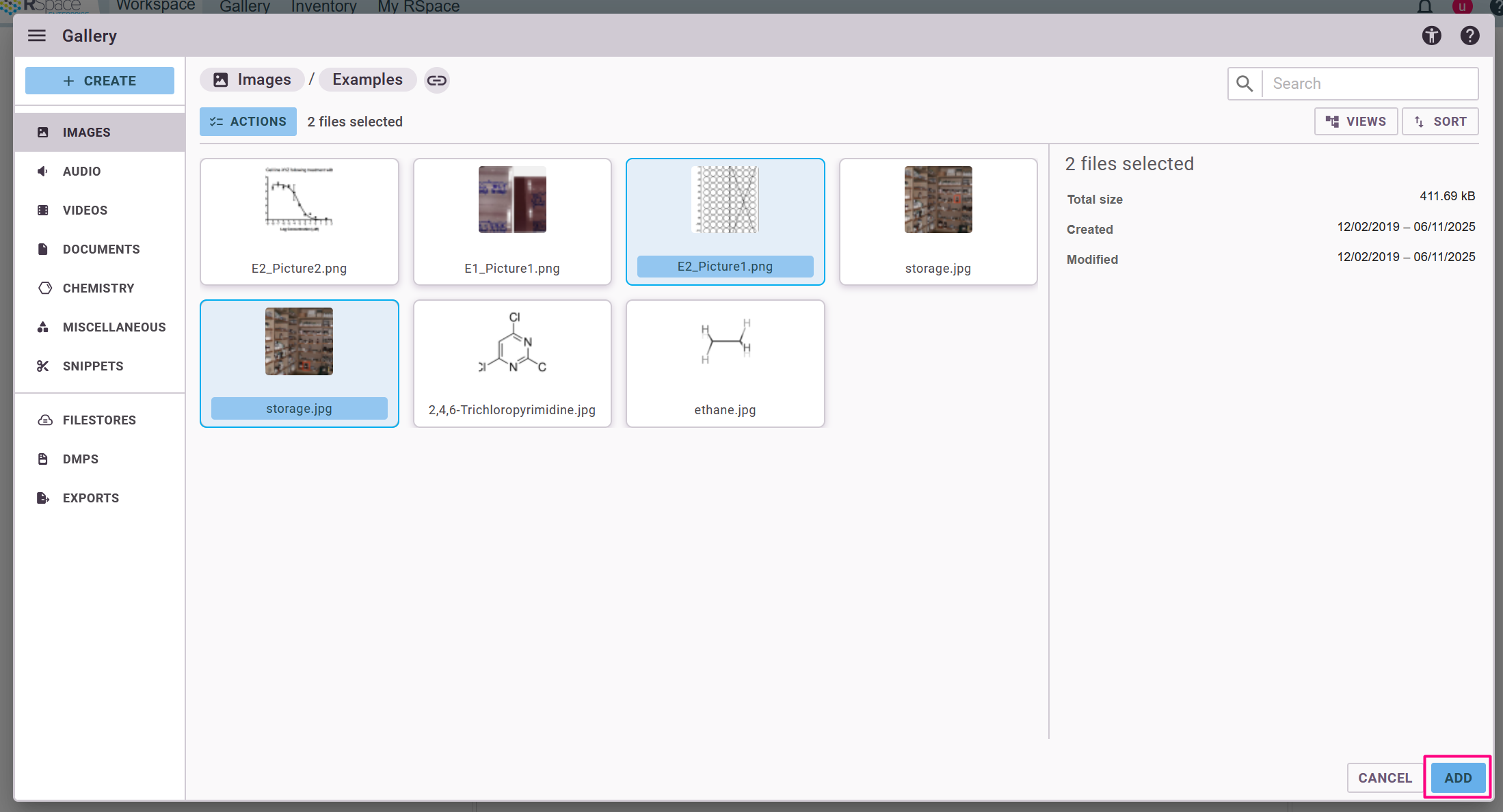 The Gallery stores files for use in your RSpace documents and notebooks, such as images, audio and video files, spreadsheets, PDFs, chemistry files and DMPs. These resources are uploaded to the Gallery once, and can then be referenced across your RSpace documents. This enhances traceability and means you can update the file from a single location, with the changes propagating to all linked documents.