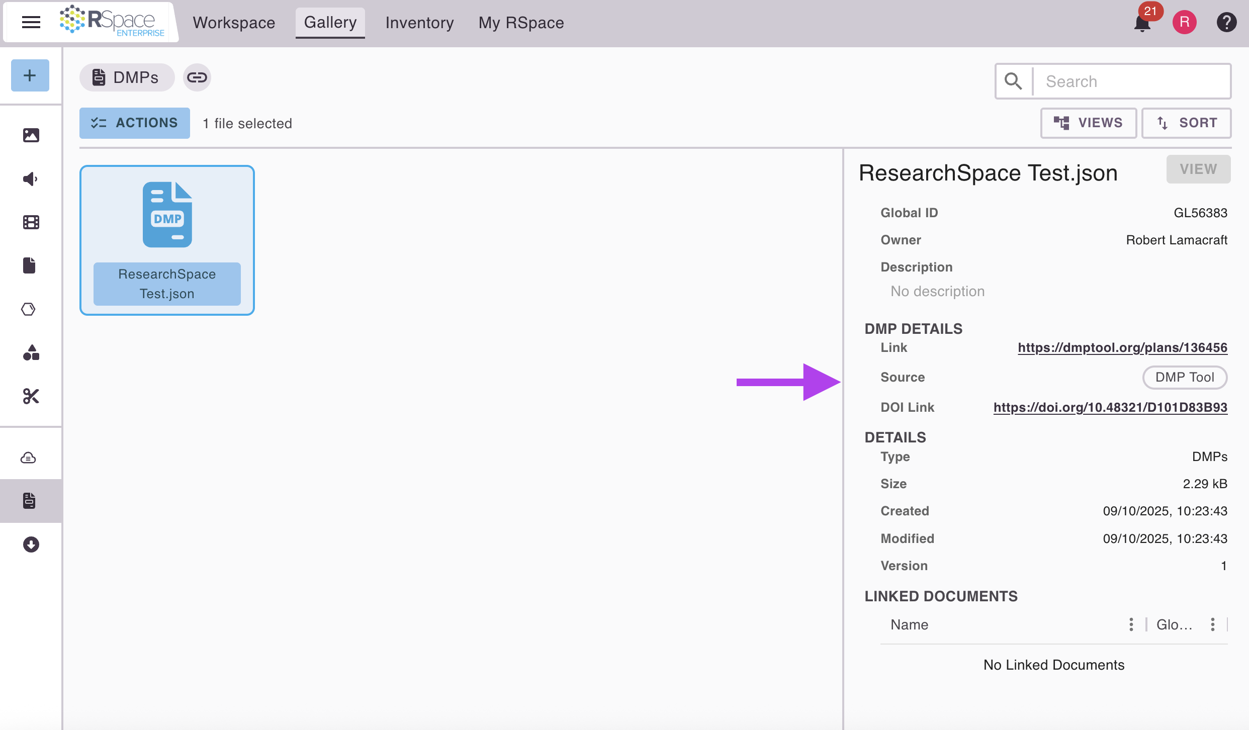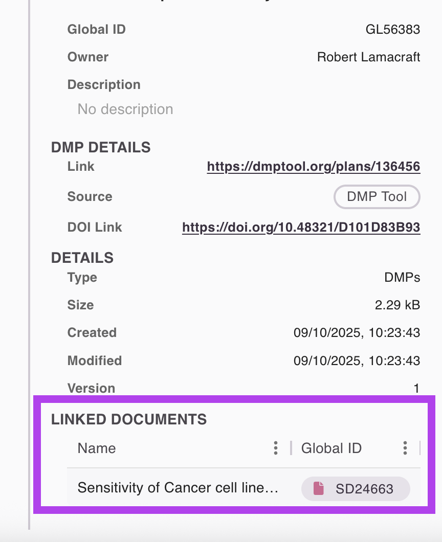 Whenever a DMP is referred to in an ELN document by linking to it (see Inserting File Attachments from Gallery), the ELN document will be added to the Linked Documents section of the DMP's info panel in the Gallery. This allows you to quickly see where the DMP has been used in documenting your research.