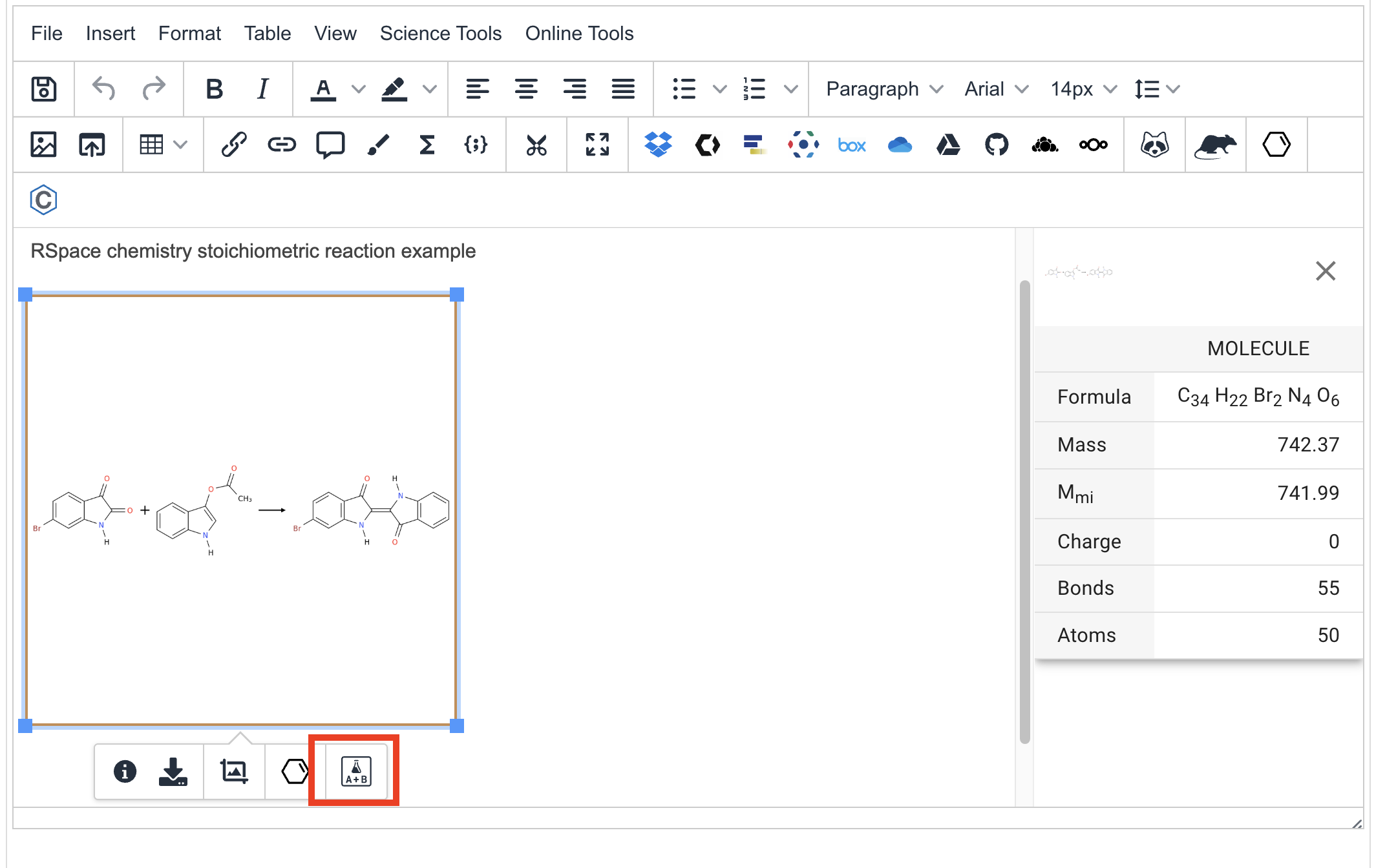 After saving the document, the chemical element will have its basic properties calculated and displayed next to it. You can also click on the image to see larger preview of the molecule or reaction, or click on the download icon to download a PNG image of the structure.