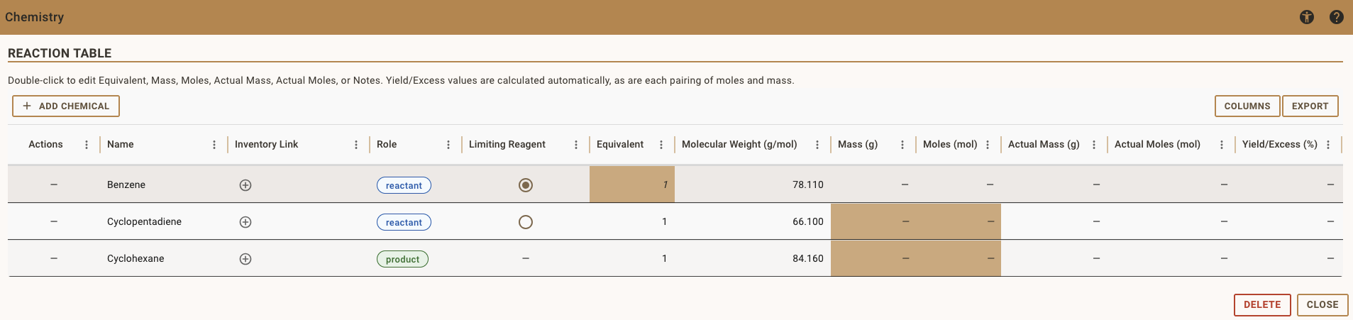 - Enter the equivalent of the newly added reagent to automatically calculate the planned amounts