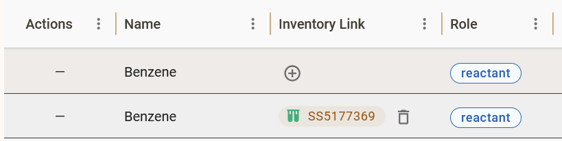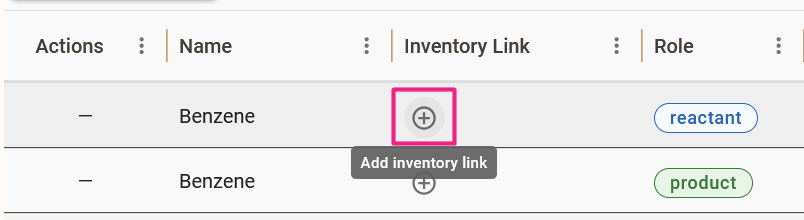 - On the row of the molecule you would like to link, click on the + button on the Inventory Link column.